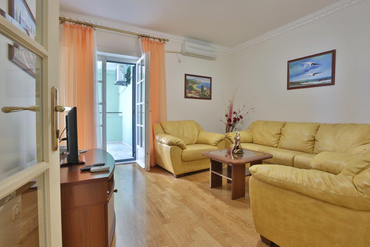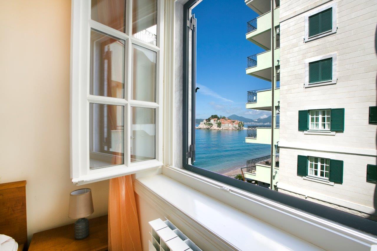 Moderno opremljen apartman, prilagodjen za udoban i prijatan porodični odmor. Lux opremljena dnevna soba izlazi na veliku terasu sa direktnim pogledom na more i jedno od najljepših mjesta na crnogorskom primoriju ostrvo Sveti Stefan.